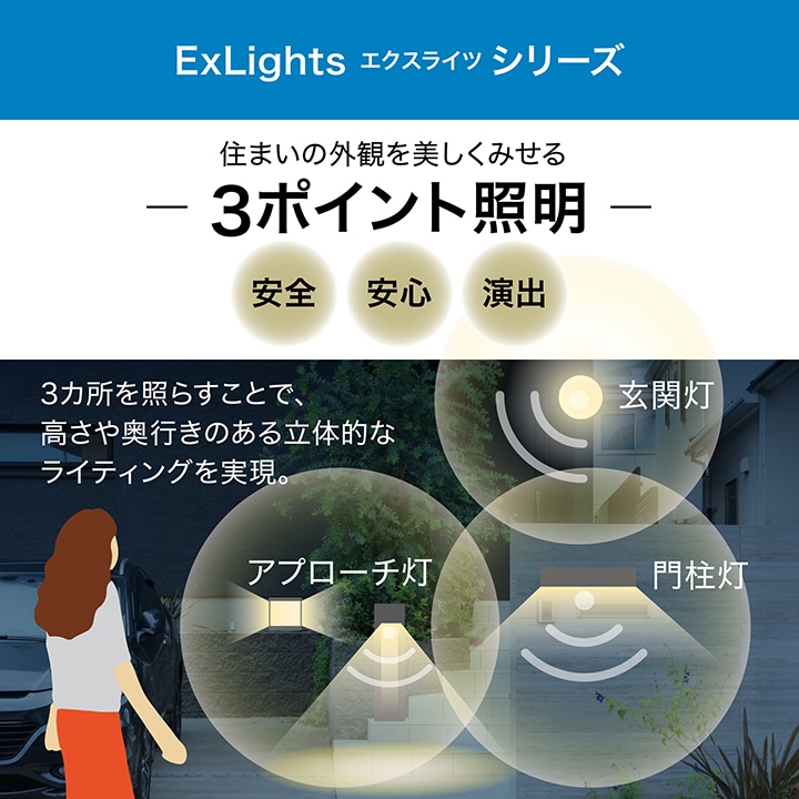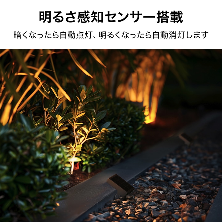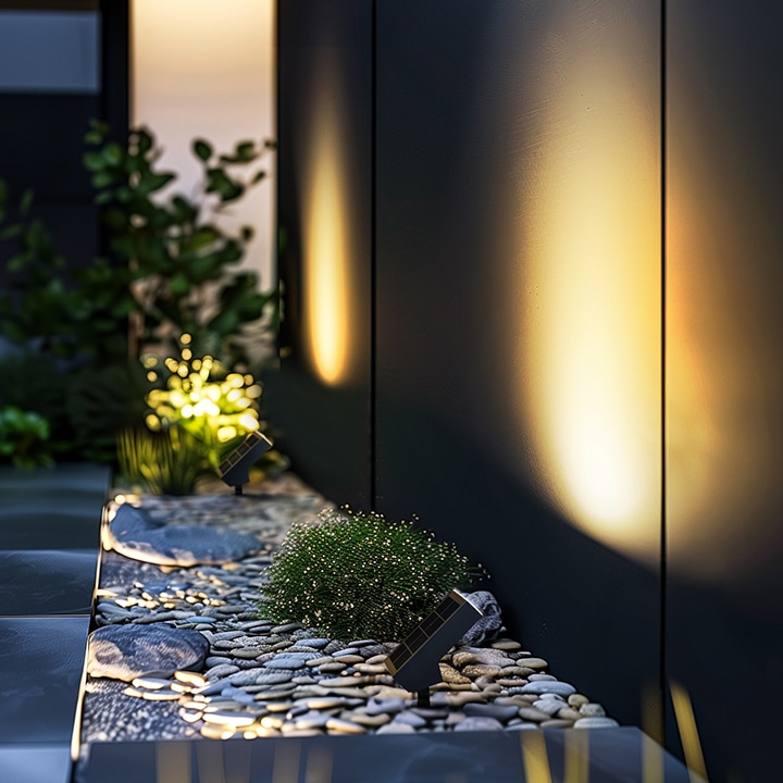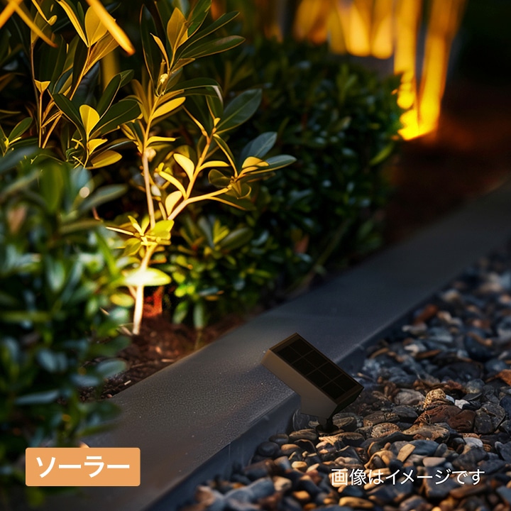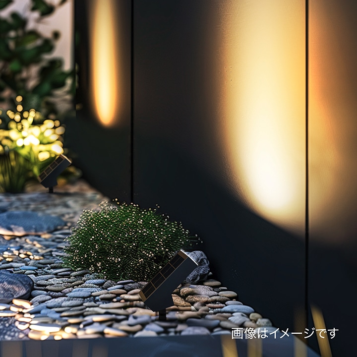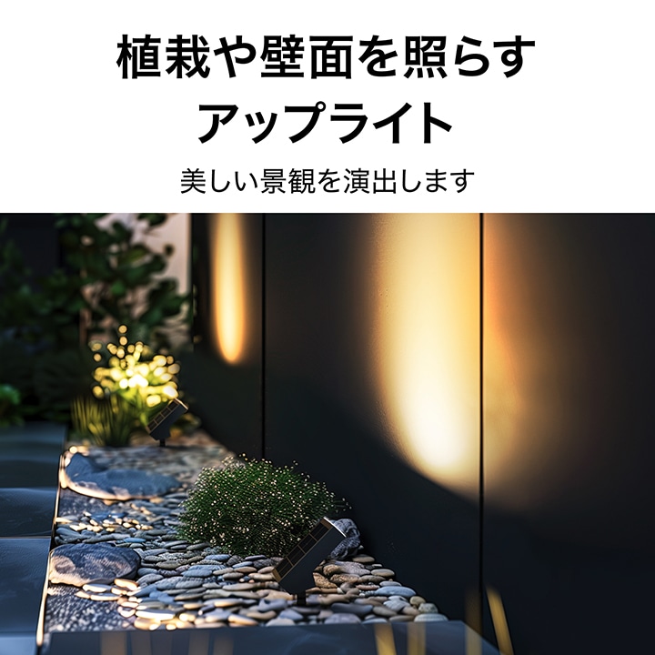 しっかりと明るく照らすソーラーライト。植栽や壁面を照らし、美しい景観を演出するライトアップ