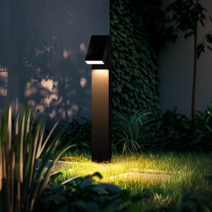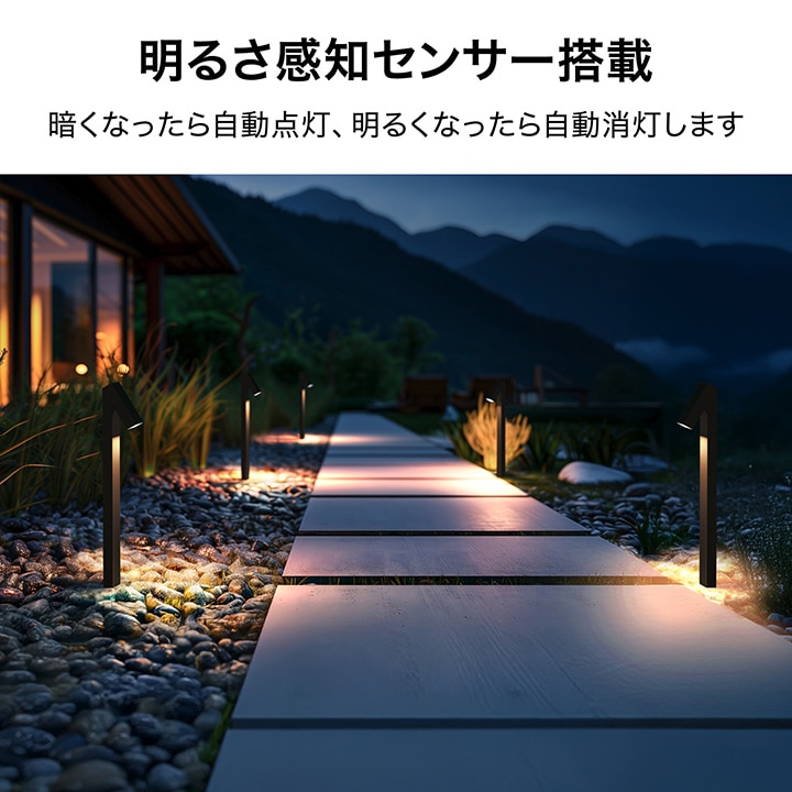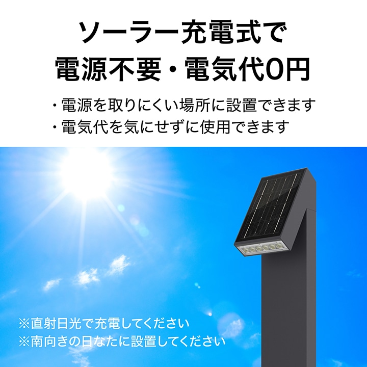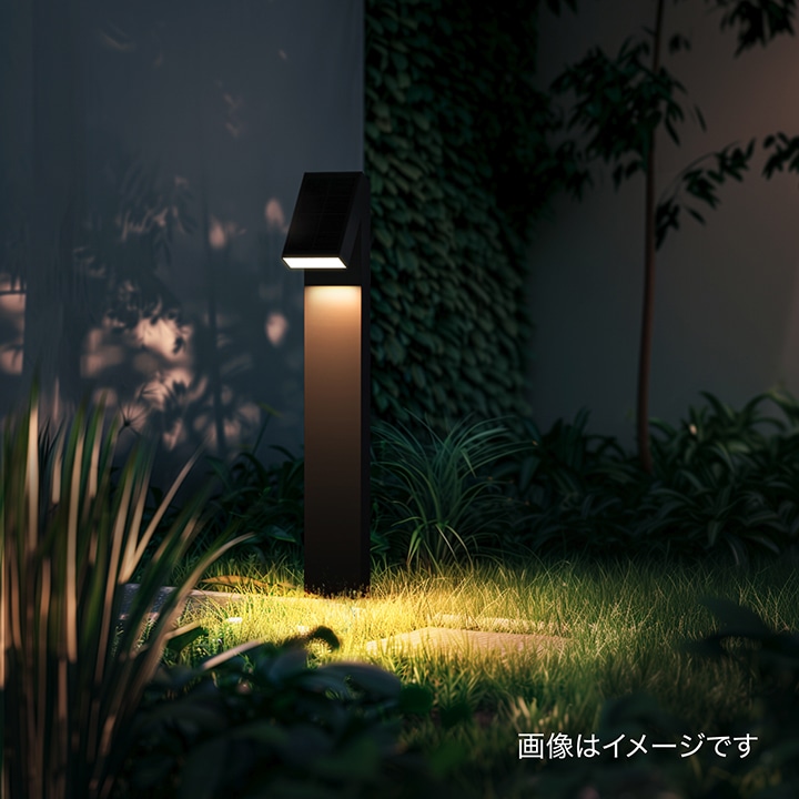 しっかりと明るく照らすソーラーライト。足元を明るく照らすスタイリッシュなポールライト。アプローチなど、エントランスの誘導灯に